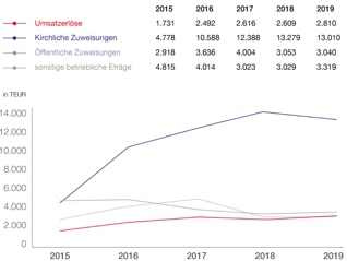 Die kirchlichen Zuweisungen stellen beim Diözesan-Caritasverband über 50 Prozent der Gesamteinnahmen dar, im Jahr 2019 machen sie 58,7 Prozent aus. Alle anderen Zuweisungen blieben im Jahresvergleich relativ konstant.